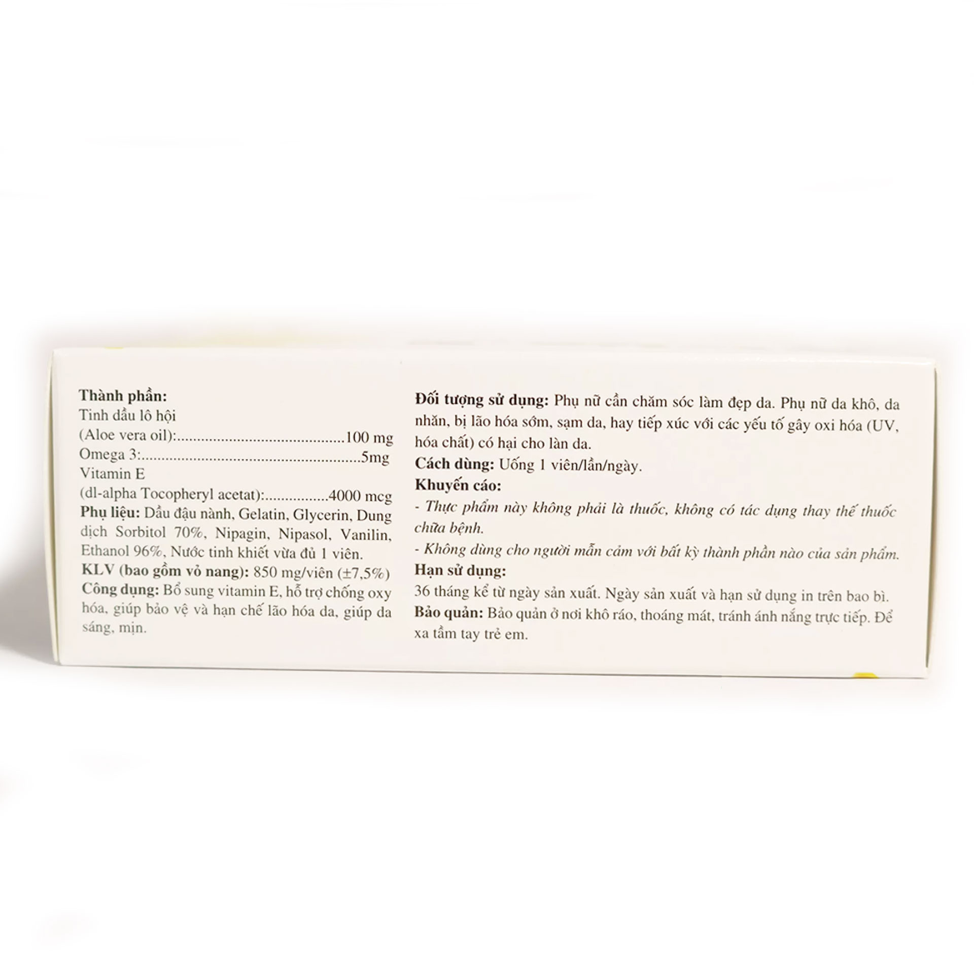 Mua tại TiktokTHÀNH PHẦN VITAMIN E ROSTEX Vitamin E : 4000mcg Omega 3: 5mg Tinh dầu Lô hội : 10mg Phụ liệu: Dầu đậu nành, Gelatin, Glycerin, Dung dịch Sorbitol 70%, Vanilin, Nipagin, Napisol, Ethanol 96%, Nước tinh khiết vừa đủ 1 viên. CÔNG DỤNG CỦA VIVITA E ROSTEX Vitamin E Rostex làm đẹp da, chống lão hóa, giảm thâm nám Vitamin E giúp da sáng mượt, hạn chế các vết nhăn, vết nám Vitamin E giúp dưỡng ẩm cho da, căng mịn da, sáng mịn da Chống oxy hóa da Viên uống đẹp da Vitamin E Vivita E Rostex Hộp 30 viên ĐỐI TƯỢNG NÊN DÙNG Người bị tổn thương da ( da khô, nám da, sạm da,tàn nhang, nhăn nha) Người có dấu hiệu lão hóa da Người thường xuyên tiếp xúc với các yếu tố gây oxy hóa (tia UV, hóa chất) có hại cho da Người có nhu cầu làm đẹp da từ bên trong HƯỚNG DẪN SỬ DỤNG Ngày uống 1 lần, mỗi lần 1 viên Nên uống buổi tối trước khi đi ngủ Sản phẩm này không phải là thuốc và không có tác dụng thay thế thuốc ch.ữa bệnh Không dành cho người có mẫn cảm với bất kỳ thành phần nào của sản phẩm