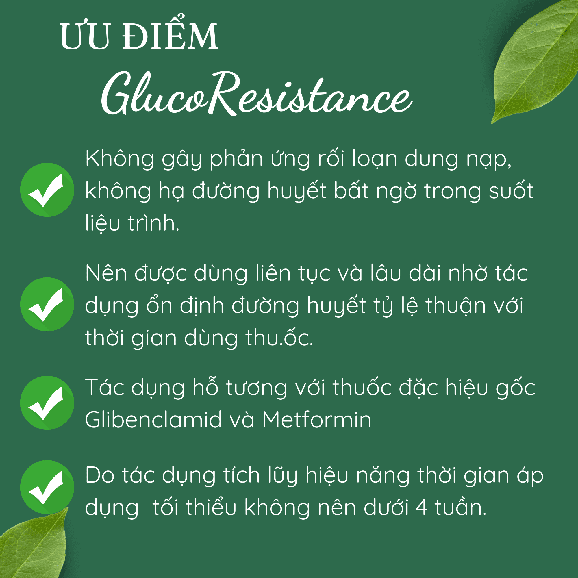- Không ghi nhận trường hợp nào phải gián đoạn liệu pháp trong suốt liệu trình vì phản ứng bất lợi về mặt lâm sàng cũng như trên xét nghiệm cận lâm sàng về chức năng gan thận. VI. KẾT LUẬN ĐỊNH TÍNH 01 | GLUCORESISTANCE rõ ràng có tác dụng hỗ tương (pharmaceutical synchronisation) với th.uốc đặ.c h.iệu gốc Glibenclamid và Metformin 02 | Nhờ thời gian khởi động tác dụng (onset of pharmaceutical action) tương đối ngắn, GLUCORESISTANCE nên được áp dụng sớm cho nhân tiể.u đường có lượng đường huyết không ổn định. 03 | Do tác dụng tích lũy hiệu năng (accumulation of pharmacodynamic effect), thời gian áp dụng GLUCORESISTANCE tối thiểu không nên dưới 4 tuần. 04 | GLUCORESISTANCE nên được dùng liên tục và lâu dài nhờ tác dụng ổn định đường huyết tỷ lệ thuận với thời gian dùng thu.ốc. 05 | GLUCORESISTANCE không cần liều cao vì đạt hiệu quả như mong muốn với liều thông dụng mỗi ngày 2 lần, mỗi lần 1 viên sau ăn sáng và sát giờ ngủ 06 | GLUCORESISTANCE không gây phản ứng rối loạn dung nạp, không h.ạ đư.ờng huyết bất ngờ trong suốt liệu trình. 07 | Với đối tượng đã phát hiện lượng đường huyết sát ngưỡng lý (người cao tuổi, nhân viêm gan, rối loạn chuyển hóa, béo phì …) nên sớm áp dụng GLUCORESISTANCE như biện pháp dự phòng.