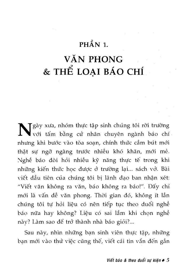 Trong cuốn Viết báo và theo đuổi sự kiện, tác giả hướng dẫn về cách sử dụng văn phong trong báo chí, kỹ thuật lấy thông tin chọn đề tài vào đúng điểm rơi thời sự và kỹ thuật "viết và lách" cho nhà báo mà không vi phạm pháp luật.