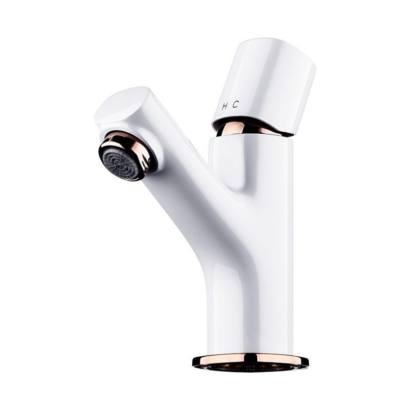 · Brass Body · Zinc Handle · Yizhan 25mm Ceramic Cartridge · Neoperl easy clean Aerator · 650mm M10 G1/2 SS Hoses 2pcs · Push up pop up waste · Finish: White + Rose Gold