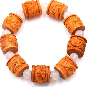 Kích thước : 9 hạt gỗ khắc hình trụ rồng 20mm x 20mm, đá thạch anh : 8 ly, vòng chuỗi dài 252mm