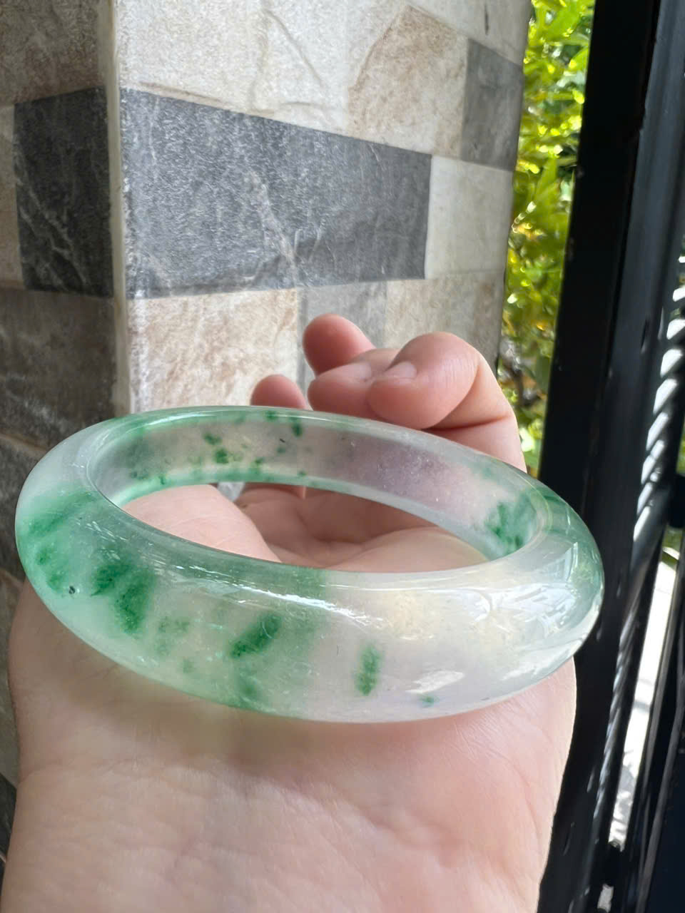 Vòng tay Nữ Đá Cẩm Thạch mới TR Lý 57 mm x cọng 7,5mm Màu Xanh lý tươi trắng 2 bên đều vòng đẹp Nữ 55kg - 64kg đeo đẹp món quà tặng chính mình