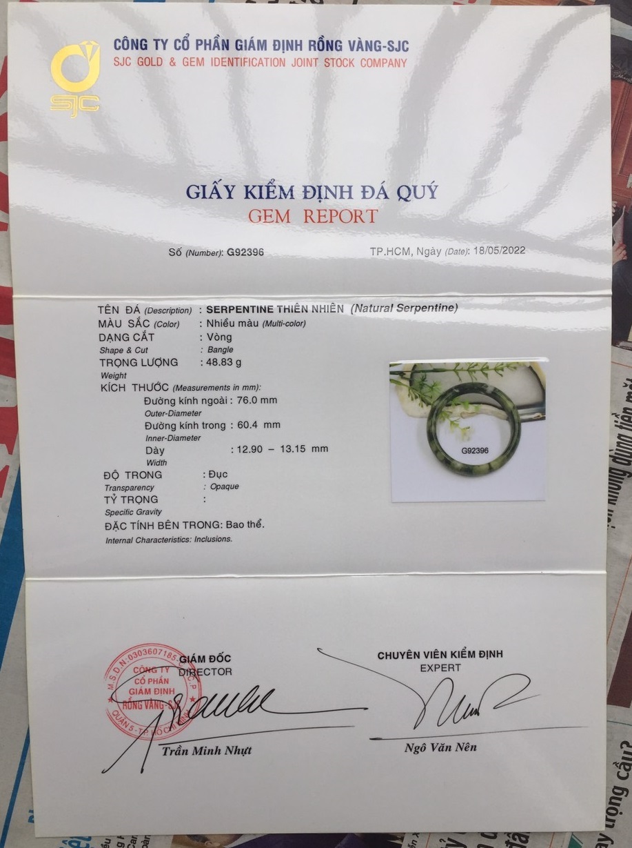 ✨Vòng tay nữ, chất liệu ngọc serpentine xanh rêu, thiết kế bản lá hẹ, kèm bản Photo giấy kiểm định chất lượng tại trung tâm vàng quốc gia SJC