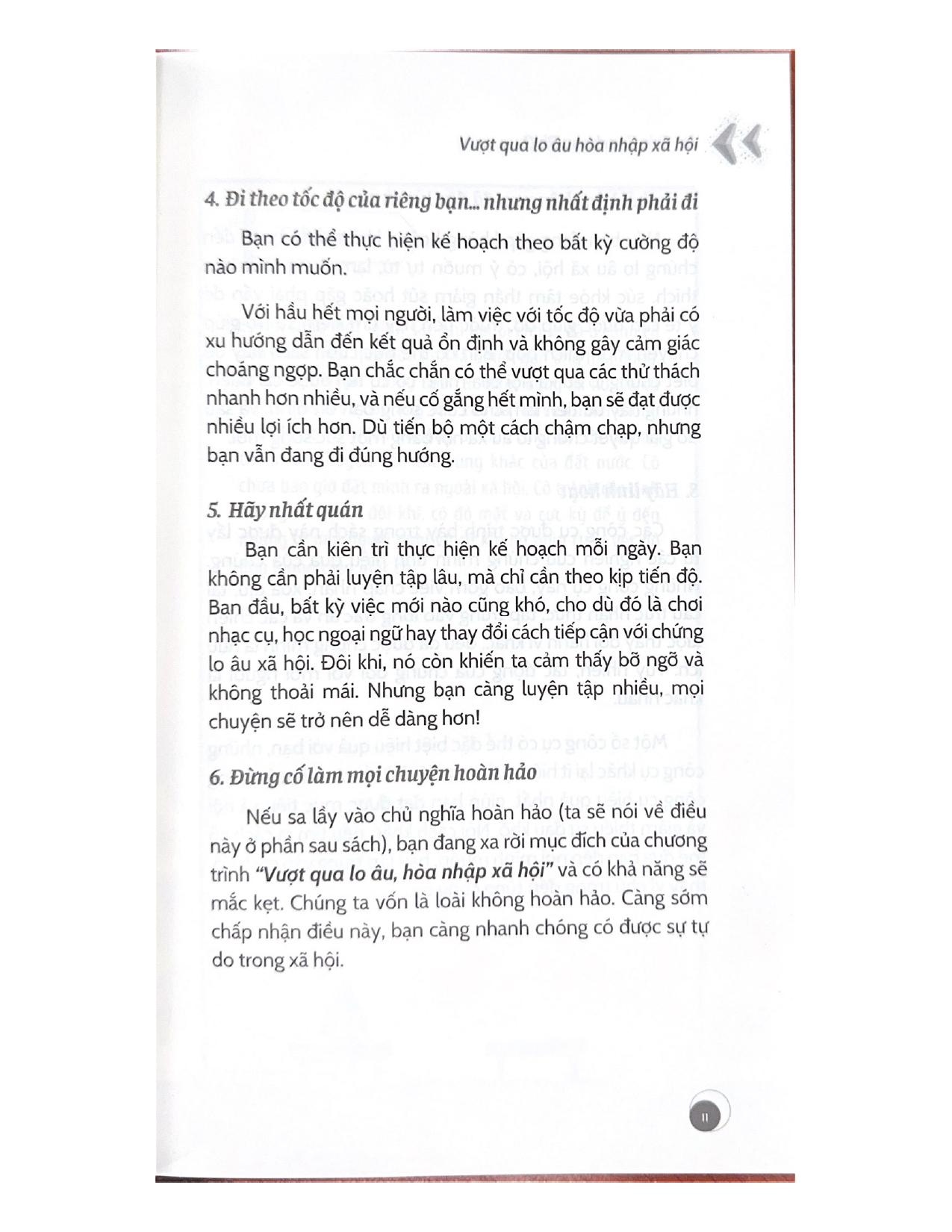 Vượt Qua Lo Âu Hòa Nhập Xã Hội trình bày các bước hành động giúp giảm thiểu đau khổ khi đối mặt với chứng lo âu xã hội, đồng thời cung cấp cho bạn công cụ để mạnh dạn hướng tới các mục tiêu xã hội của mình. Kết hợp các chiến lược từ nhiều liệu pháp hiện đại, sách giúp bạn đối phó và vượt qua những suy nghĩ cũng như cảm xúc lo âu với nhiều bài tập thực tế và nghiên cứu điển hình.