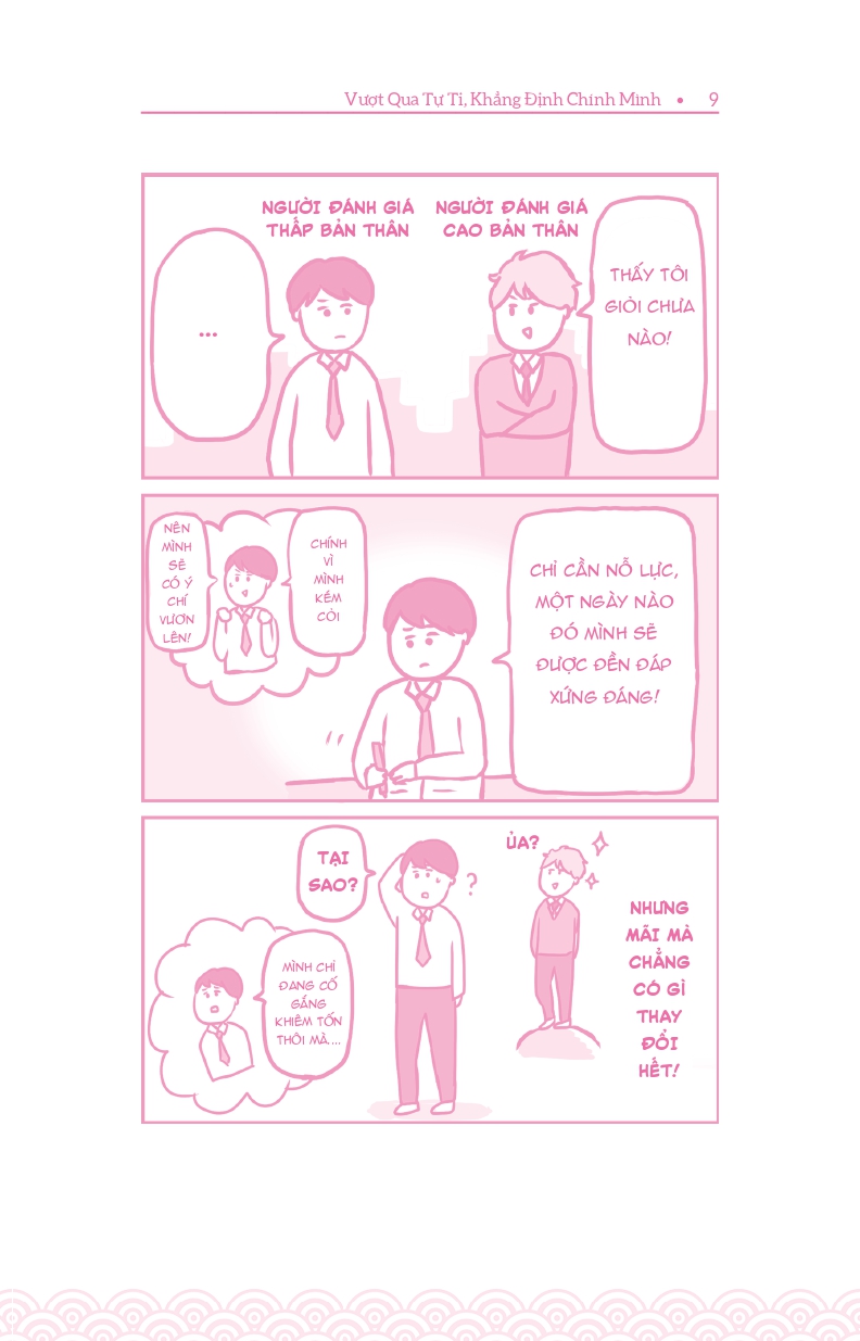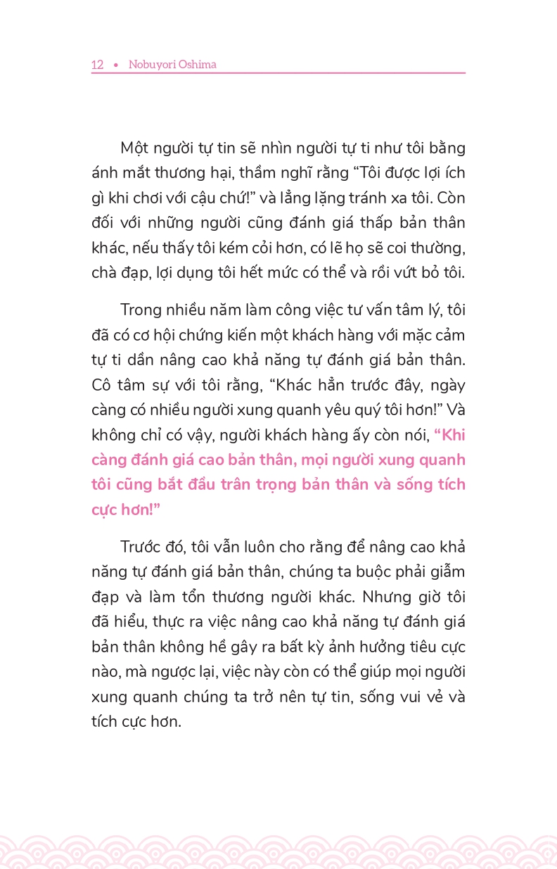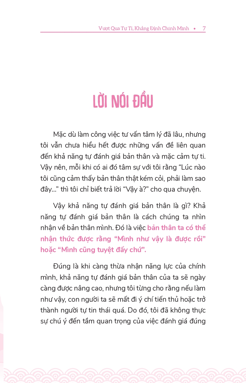 - Giới thiệu Vượt Qua Tự Ti - Khẳng Định Chính Mình Bất kể trong công việc hay cuộc sống, tự tin luôn là yếu tố hàng đầu dẫn dắt chúng ta tới thành công Thế nhưng, có không ít người lại có khuynh hướng đánh giá thấp bản thân, luôn tự chỉ trích chính mình, không ngừng bận tâm đến ánh mắt của người đời hoặc cố gắng tỏ ra khiêm tốn để được mọi người yêu mến. Bạn có đang rơi vào tình trạng tương tự như vậy không? Nếu có, VƯỢT QUA TỰ TI, KHẲNG ĐỊNH CHÍNH MÌNH là bí quyết giúp bạn thay đổi cuộc đời mình. Thông qua những hình ảnh minh họa sinh động, tác giả Nobuyori Oshima sẽ cung cấp nhiều phương pháp đơn giản mà hiệu quả nhằm giúp bạn từng bước nâng cao sự tự tin, biết cách đánh giá đúng mức bản thân và xây dựng cuộc sống mà bạn mong muốn.