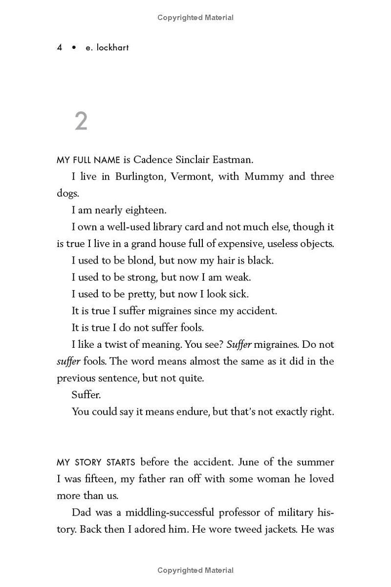 A beautiful and distinguished family. A private island. A brilliant, damaged girl; a passionate, political boy. A group of four friends—the Liars—whose friendship turns destructive. A revolution. An accident. A secret. Lies upon lies. True love. The truth.