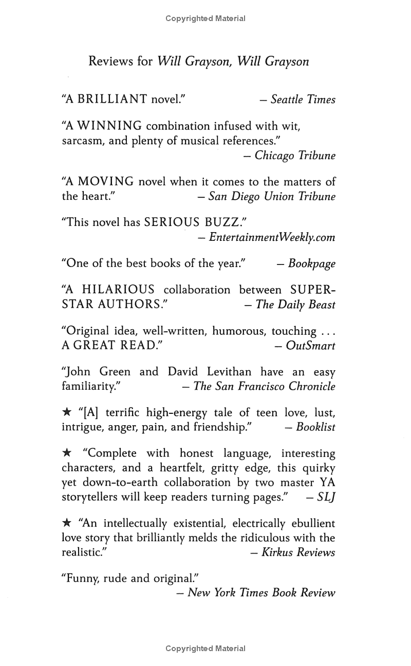 One cold night, in a most unlikely corner of Chicago, Will Grayson crosses paths with . . . Will Grayson. Two guys with the same name, running in two very different circles, suddenly find their lives going in new and unexpected directions, and culminating in epic turns-of-heart and the most fabulous musical ever to grace the high-school stage.