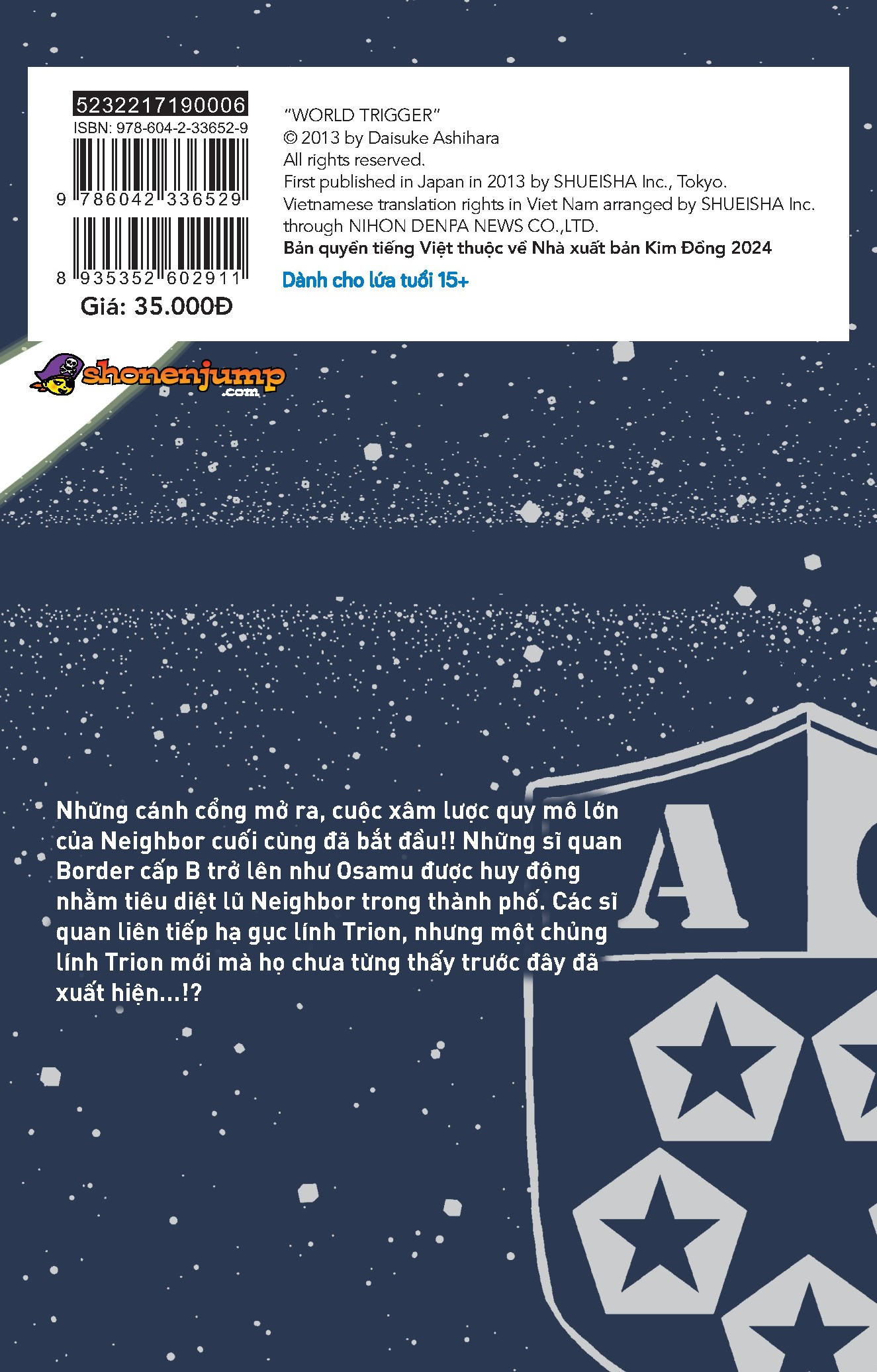 Mua tại TiktokMã hàng 8935352602911 Độ Tuổi 15+ Tên Nhà Cung Cấp Nhà Xuất Bản Kim Đồng Tác giả Daisuke Ashihara Người Dịch Yoda NXB Kim Đồng Năm XB 2024 Ngôn Ngữ Tiếng Việt Trọng lượng (gr) 210 Kích Thước Bao Bì 17.6 x 11.3 x 0.9 cm Số trang 192 Hình thức Bìa Mềm World Trigger - Tập 6 Những cánh cổng mở ra, cuộc xâm lược quy mô lớn của Neighbor cuối cùng đã bắt đầu!! Những sĩ quan Border cấp B trở lên như Osamu được huy động nhằm tiêu diệt lũ Neighbor trong thành phố. Các sĩ quan liên tiếp hạ gục lính Trion, nhưng một chủng lính Trion mới mà họ chưa từng thấy trước đây đã xuất hiện...!?