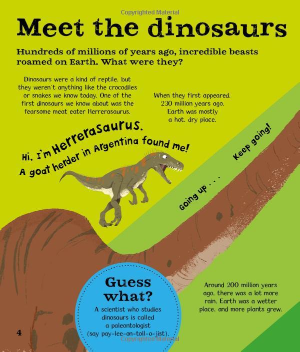 Did you know that the word dinosaur means "terrible lizard", the heaviest dinosaur weighed as much as 17 African elephants, and that Stegosaurus had a brain the size of a walnut? Learn more surprising facts in this lively and fascinating picture book all about dinosaurs.