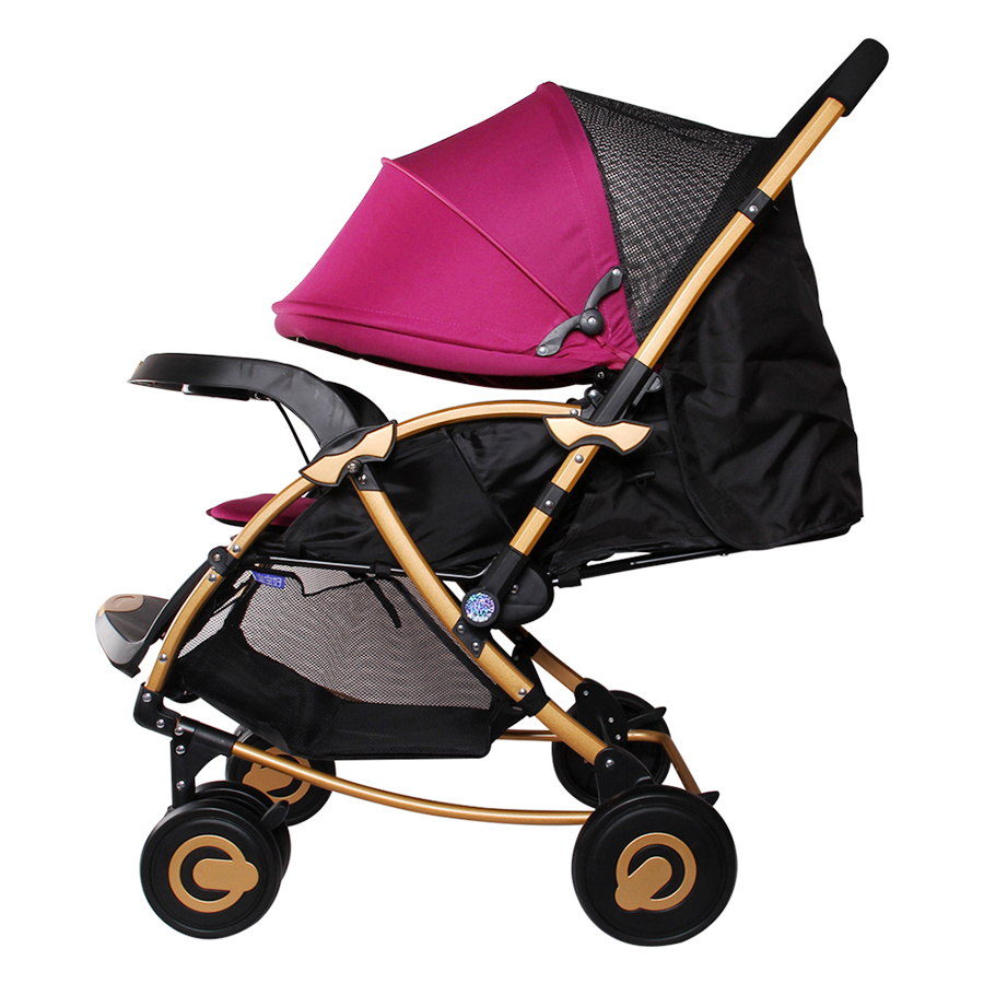 Xe được thiết kế là xe đẩy siêu nhẹ và gọn. Có thêm mái che ở bên trên.