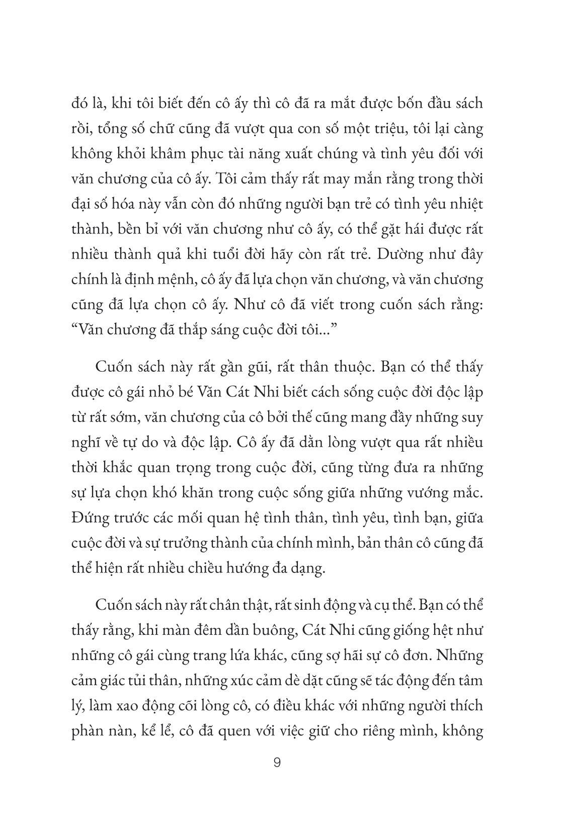 Những câu chuyện có thật ngoài đời thực cùng với giọng văn sắc sảo nhưng cũng không kém phần hài hước và ấm áp của Văn Cát Nhi, cuốn sách “Xé vài trang thanh xuân, đổi lấy một bản thân nỗ lực” sẽ giúp những người trẻ đang hoang mang, mơ hồ nhìn ra chân lý của cuộc sống mà vẫn tin yêu cuộc đời, đồng thời truyền cảm hứng để người trẻ trưởng thành hơn thông qua thông điệp: “Dù cuộc đời có cả ngàn lý do khiến bạn khóc thì bạn cũng phải viện ra cả vạn lý do để cười.”