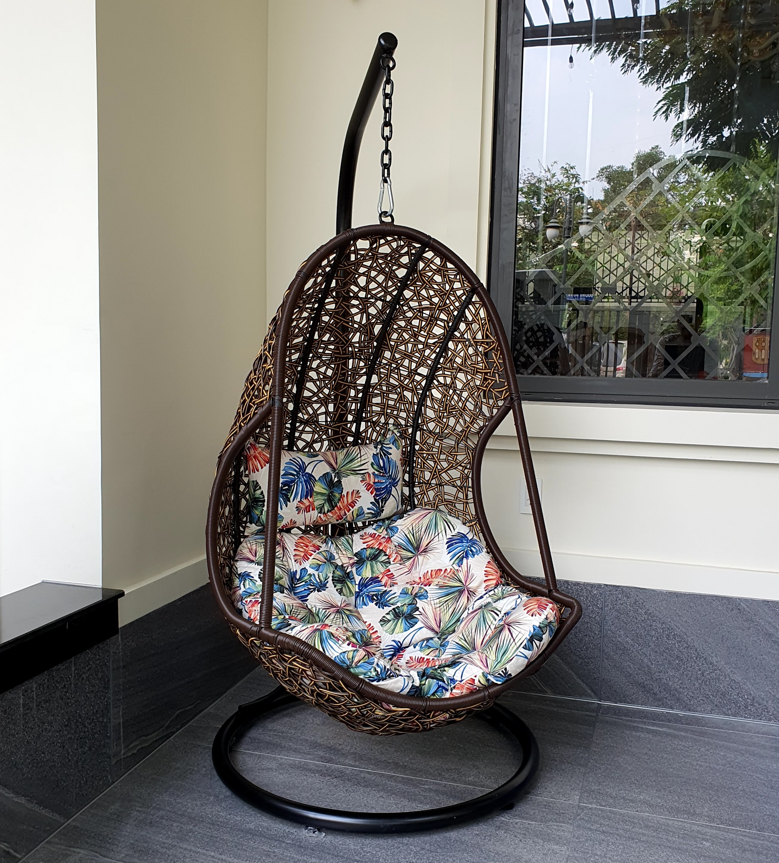 Bộ sản phẩm gồm : + Chân đế xích đu  + lồng xích đu  + Bộ nệm xích đu vỏ có thể tháo rời  Sản phẩm được nhà bán chụp hình thực tế tại showroom