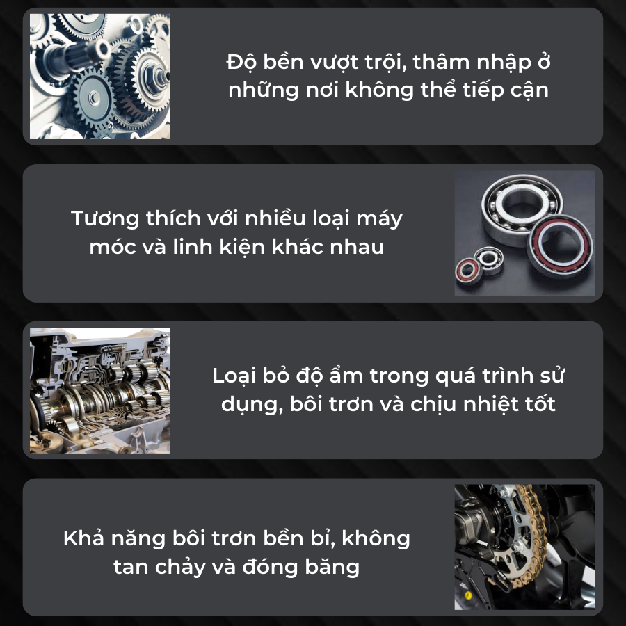 KEROSENE, DIMETHYL ETHER: Dùng làm dung môi hoà tan mỡ lithium trong bình xịt và KEROSENE cũng là bôi trơn, cung cấp lớp bôi trơn nhẹ giúp cải thiện hiệu suất bôi trơn.
