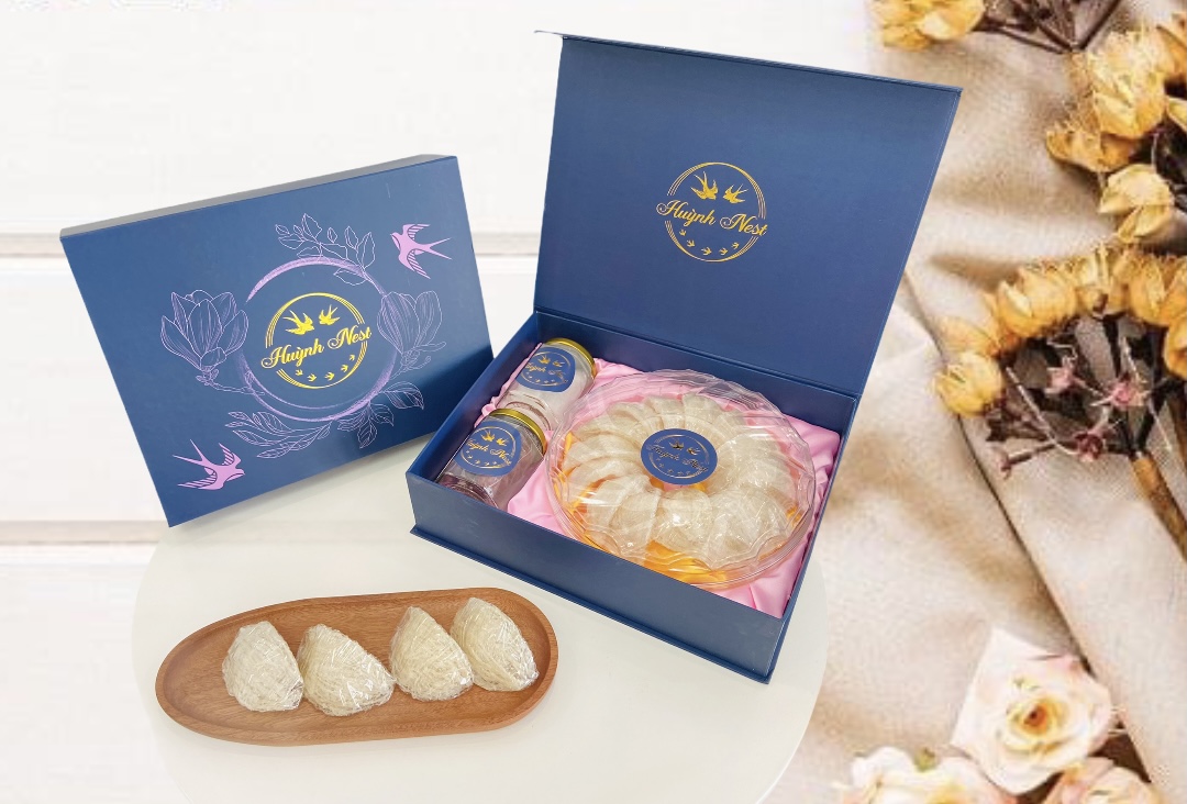 Hộp giấy chữ nhật kích thước 23x28x6 (cm) Gồm 2 hộp, mỗi hộp gồm 60 phần yến, mỗi phần 1,5 g + 60 gói đường phèn, mỗi gói 7 g 100% yến nguyên chất, KHÔNG